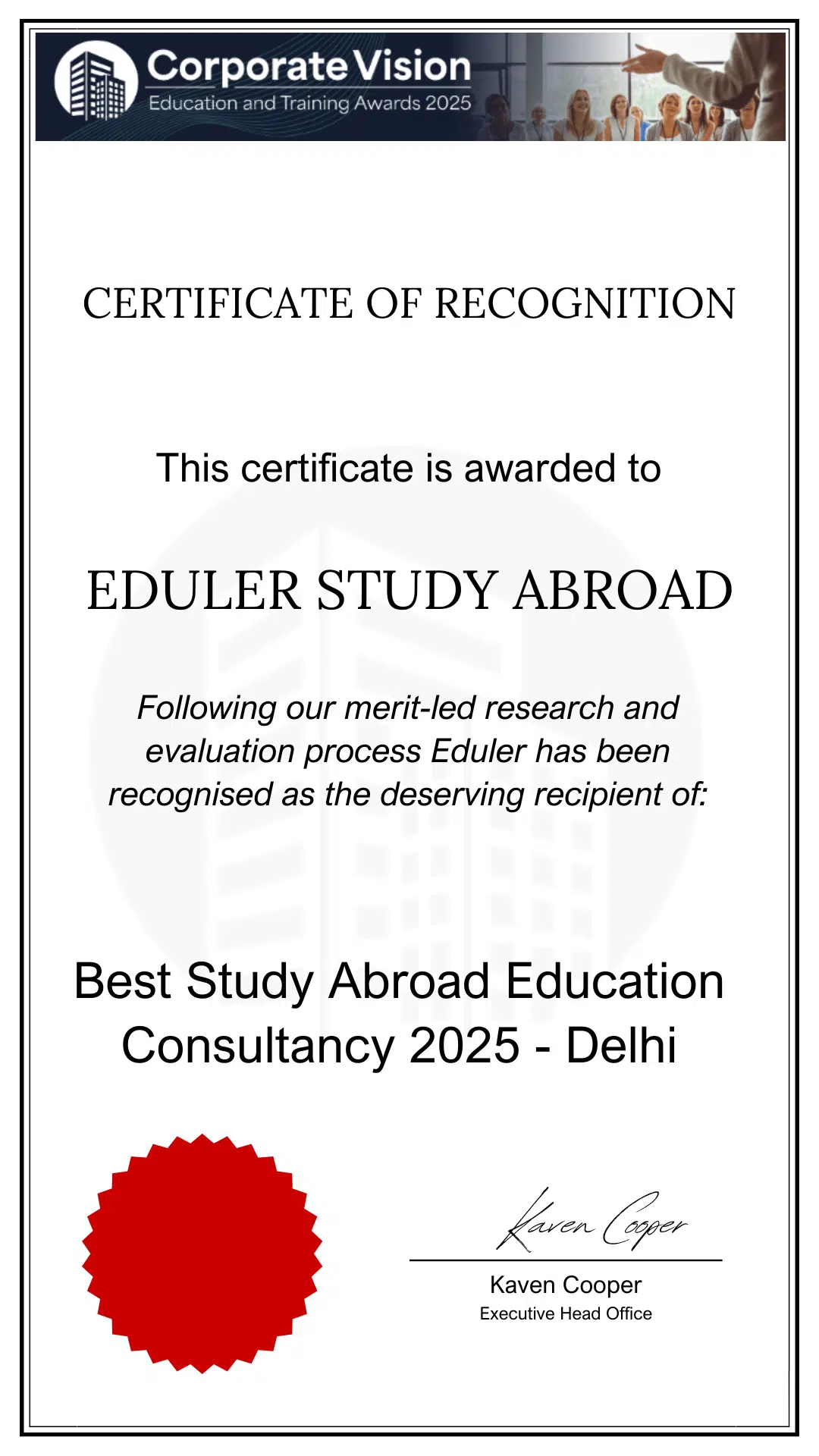 Recognized as Delhi NCRs Leading Study Abroad Consultant by Corporate Vision